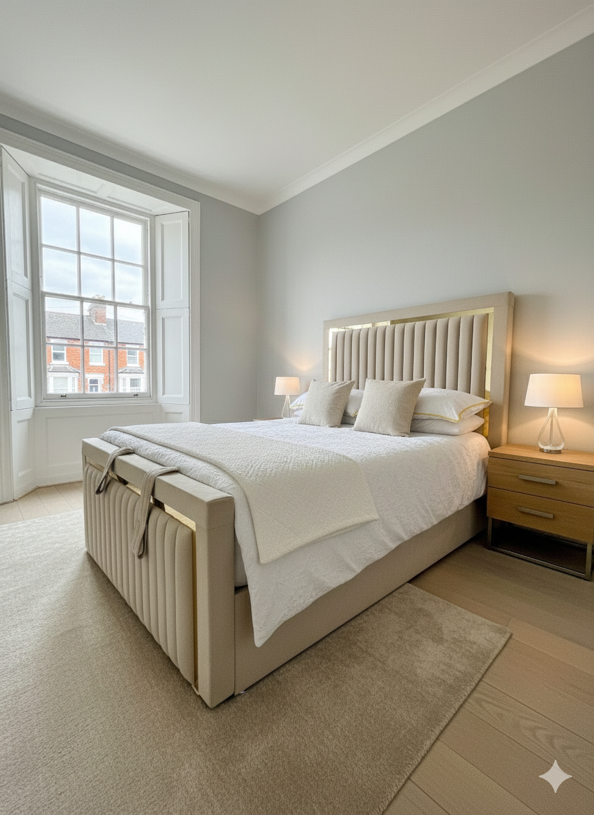 This elegant Double Arlington bed combines sophisticated design with practical functionality. The beautiful 60" Iris Headboard features subtle gold stripe detailing that adds a touch of luxury to your bedroom. The matching footboard completes the cohesive look, while the divan base with ottoman storage provides ample space to store bedding, pillows, and seasonal items.