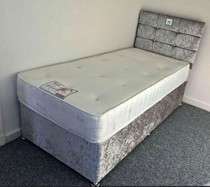 Single Divan Sliver Crush Velvet - 20 inches Headboard - Cube Diamond