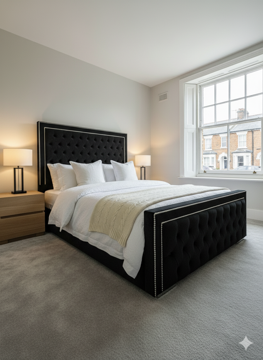 The Stylo Frame Bed combines contemporary design with timeless elegance. Featuring a striking 54-inch double silver piping headboard, this bed creates a sophisticated focal point in any bedroom. The silver accent piping adds a modern touch that complements various interior styles while providing exceptional comfort and support.