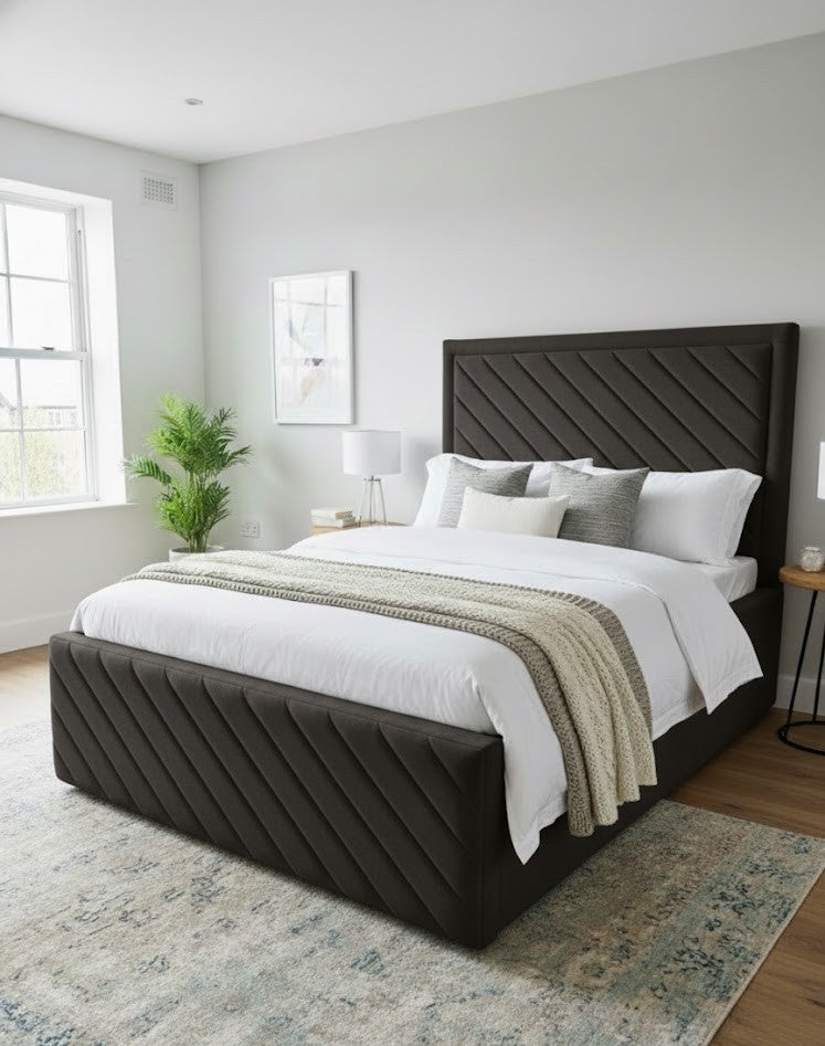 The Windsor High Side Frame Bed combines classic elegance with practical design, featuring a distinctive 60" diagonal line pattern on both headboard and footboard. This statement piece brings sophisticated style to any bedroom whilst the elevated side frame construction provides structural integrity and visual presence. The geometric detailing adds contemporary flair to traditional craftsmanship, making it an ideal choice for those seeking a bed that balances timeless appeal with modern aesthetics. Perfect for creating a focal point in your bedroom sanctuary.