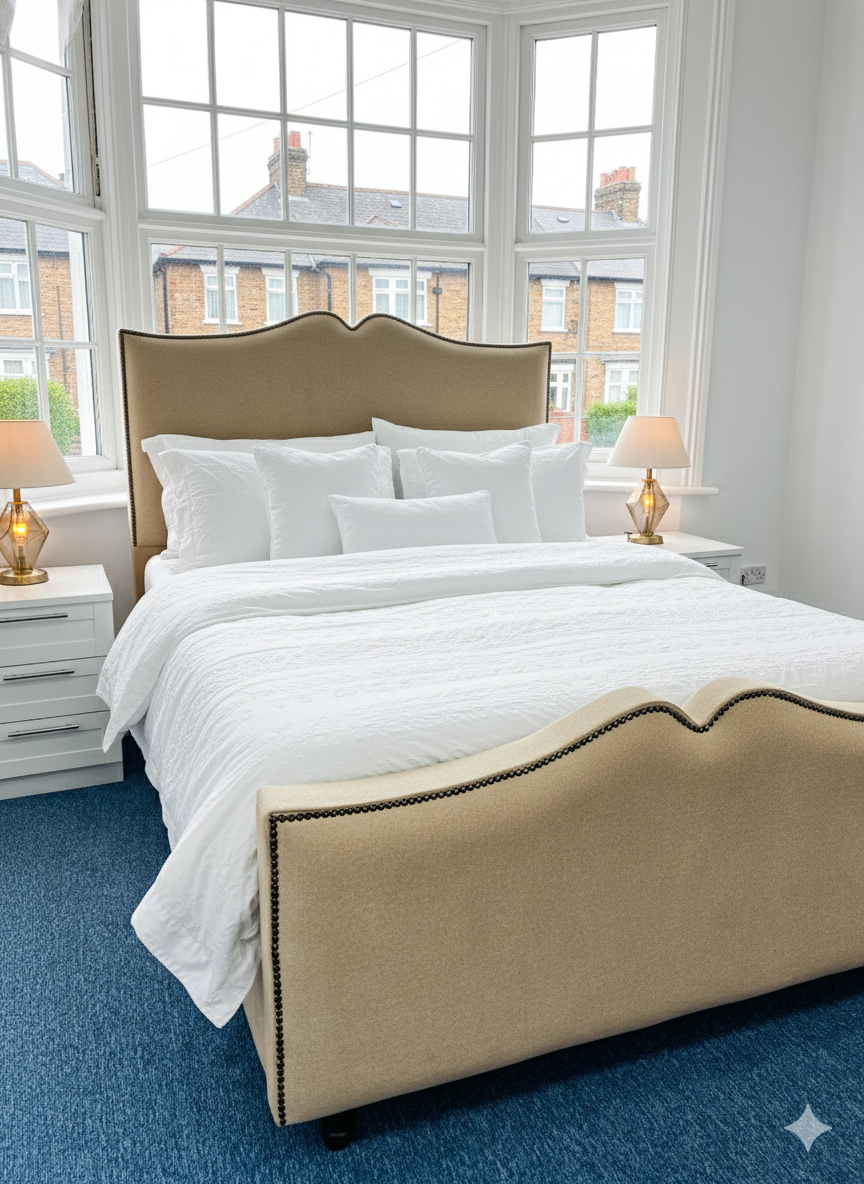 Elevate your bedroom with this sophisticated wool fabric double bed, featuring a gracefully curved headboard that commands attention. Upholstered in warm beige tones, the frame combines aesthetic refinement with structural integrity, whilst the coordinating bedding and footboard create a cohesive, designer-curated look. The wool fabric offers natural breathability and durability, ensuring lasting comfort and easy maintenance. Perfect for those seeking a contemporary yet timeless bedroom centrepiece that balances elegance with everyday practicality.