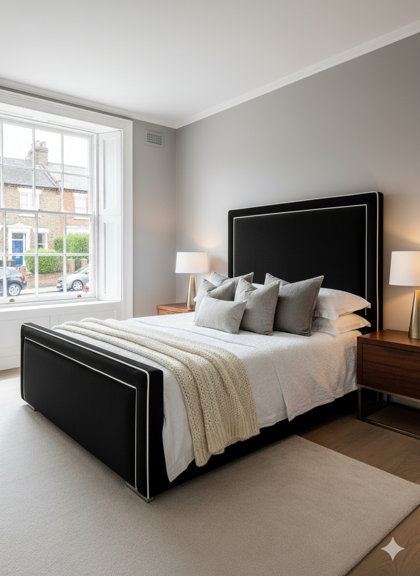 Distinctive double piping detail adds texture and sophistication to the elegant headboard design